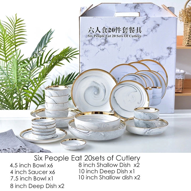 EHONGHONG 20pcs Pink/Grey Marble Ceramic Dinnerware Set Rice Salad